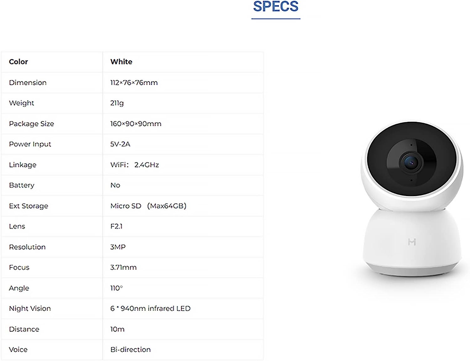 The IMILAB A1 records videos in very high resolution to -2304 x 1296 px. The IMILAB A1 has a sleek, modern design that fits into any home. Made from the finest materials, it is the perfect budget solution for any house or apartment.