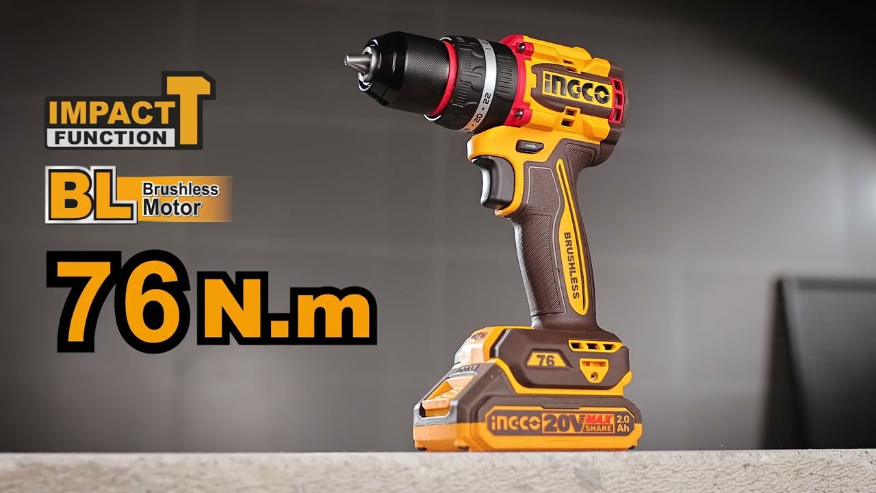 INGCO IMPACT DRILL BRUSHLESS CORDLESS 2 BAT 2.0 AMP + CHARGER 76 NM