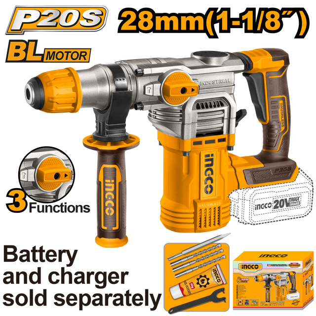 The INGCO CRHLI20288 20V Cordless Rotary Hammer is a powerful and versatile tool designed for drilling, hammer drilling, and chiseling. With a brushless motor, SDS Plus chuck, and 3-function operation, it's ideal for both professionals and DIYers. Powered by a 20V lithium-ion battery, it offers cordless convenience and high performance for concrete, wood, and steel applications.