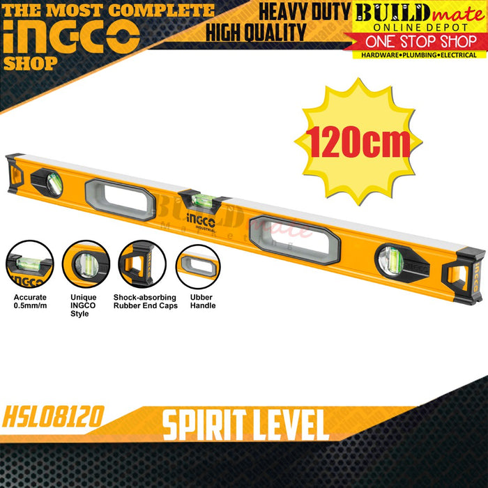 The INGCO HSL08120 Spirit Level is a durable and precise measuring tool designed for professionals and DIY enthusiasts. With a 120cm length, three easy-to-read vials, and a lightweight aluminum body, it ensures accurate leveling for all your construction and carpentry needs.