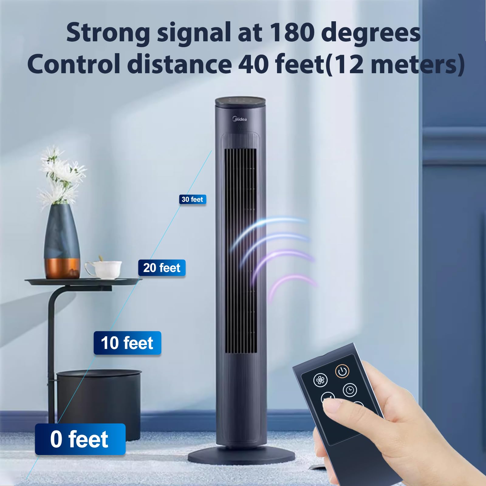 The MIDEA Tower Fan 40'' in Black with Remote Control (SKU FZ1018TRB) offers powerful cooling with a sleek, modern design. Key features include a 40-inch height for optimal air circulation, multiple speed settings, and a convenient remote control for easy operation. Perfect for any room, this fan combines style and functionality to keep you cool and comfortable.