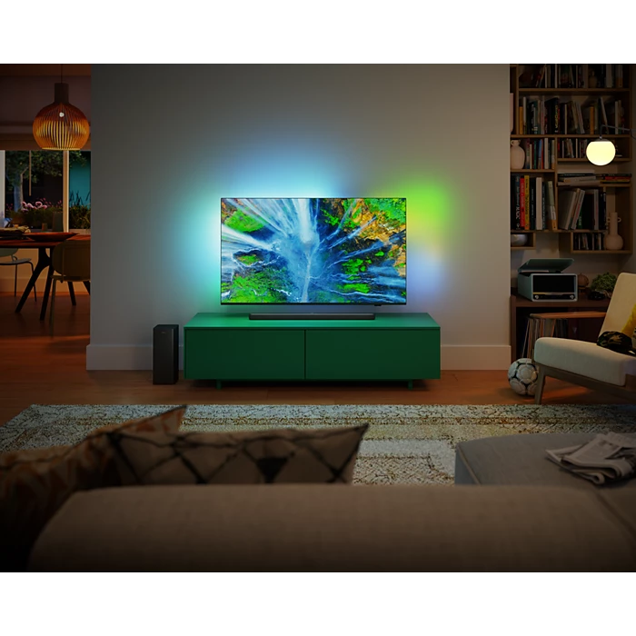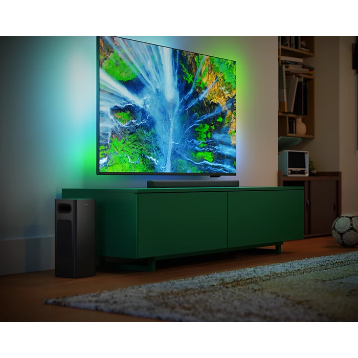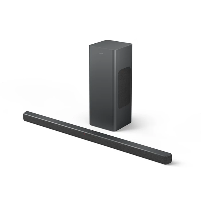 The Philips TAB6309/10 is an ultra-slim 2.1 channel soundbar system that delivers powerful cinematic audio without obstructing your TV screen. Standing at only 37mm tall, it is designed to fit under even the lowest-profile TVs, while the wireless compact subwoofer can be tucked away or even placed horizontally under furniture to save space. Despite its slim build, it packs a punch with 320W max power and supports Dolby Atmos and DTS Virtual:X for a truly immersive, 3D soundstage. Connectivity is seamless with HDMI eARC, allowing you to control the soundbar with your TV remote, and Bluetooth 5.3 for stable, high-quality music streaming from your phone or tablet. En savoir plus
