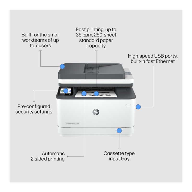 The HP LaserJet Pro MFP 3103fdn Printer (SKU: 3G631A) is a high-performance monochrome multifunction printer designed for small to medium-sized businesses. It offers fast print speeds, automatic duplex printing, robust security features, and seamless connectivity, making it ideal for boosting productivity and efficiency.