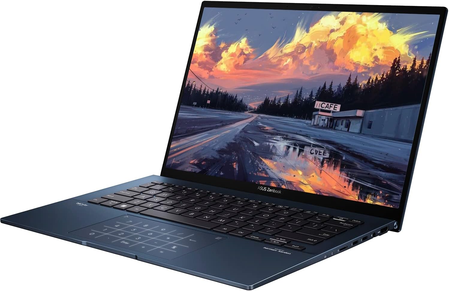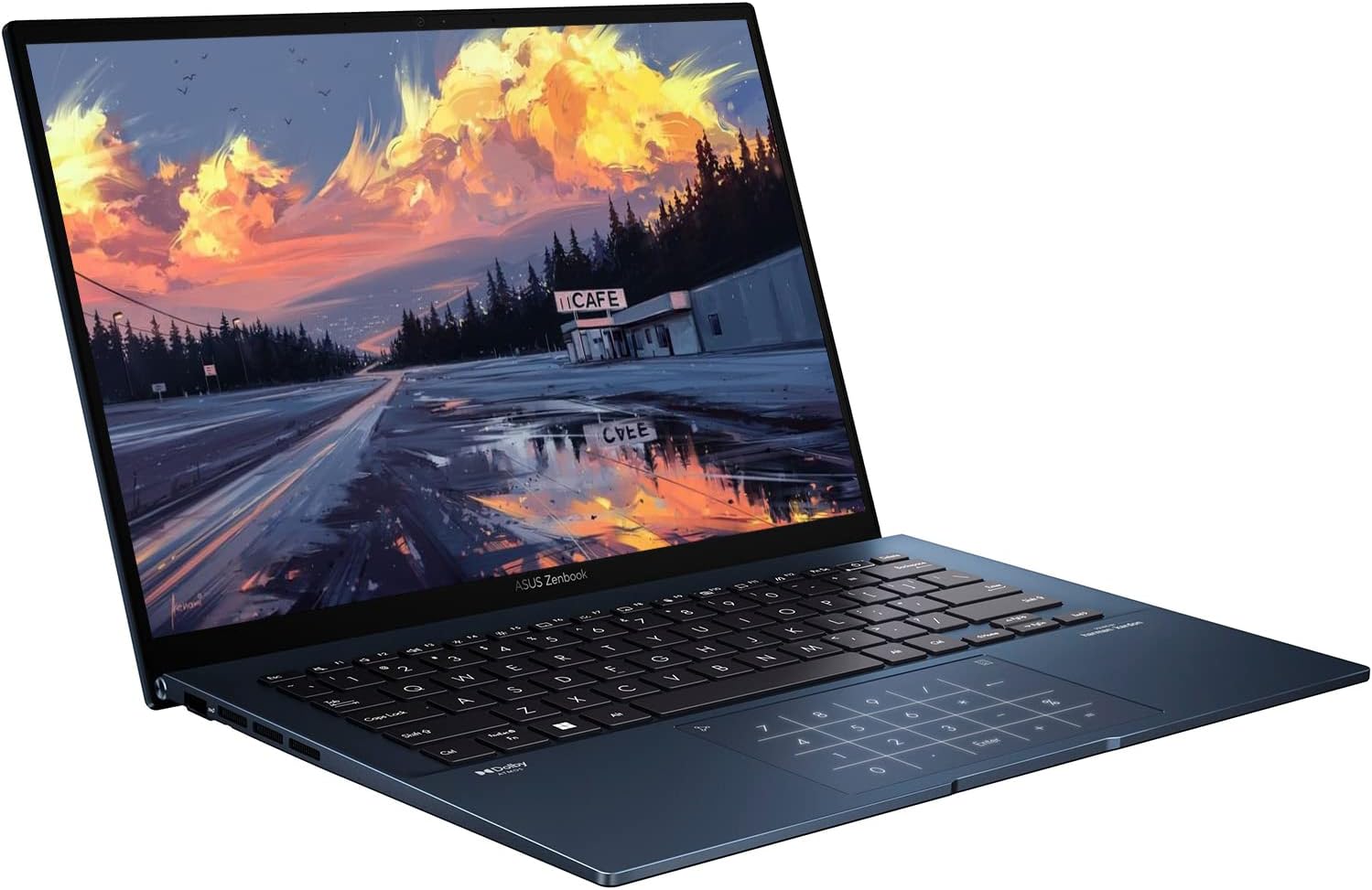 The powerful and compact Zenbook 14 OLED is just 16.9 mm slim and 1.39 kg1 light, with a breathtaking new design that s timelessly elegant yet totally modern. You ll experience perfect visuals from the expansive 16:10 2.8K OLED HDR NanoEdge display2,3, a color-accurate up to 600-nit screen that s PANTONE Validated and has a cinema-grade 100% DCI-P3 gamut. The 12th Gen Intel Core i5 processor, Intel Iris Xe graphics, 8 GB RAM and 256 GB PCIe 4.0 SSD deliver superb performance, and there s a long-lasting 75 Wh battery. For extraordinary sound, there s a Dolby Atmos sound system powered by a smart amplifier. The user-centric design includes one-touch login with a fingerprint sensor on the power button, the new ASUS ErgoSense keyboard, and the efficient ASUS NumberPad 2.0. The bold new lid design is inspired by timeless Kintsugi craftsmanship, and it s finished in fresh new Ponder Blue. Zenbook 14 OLED is the new benchmark for portable perfection. Read more