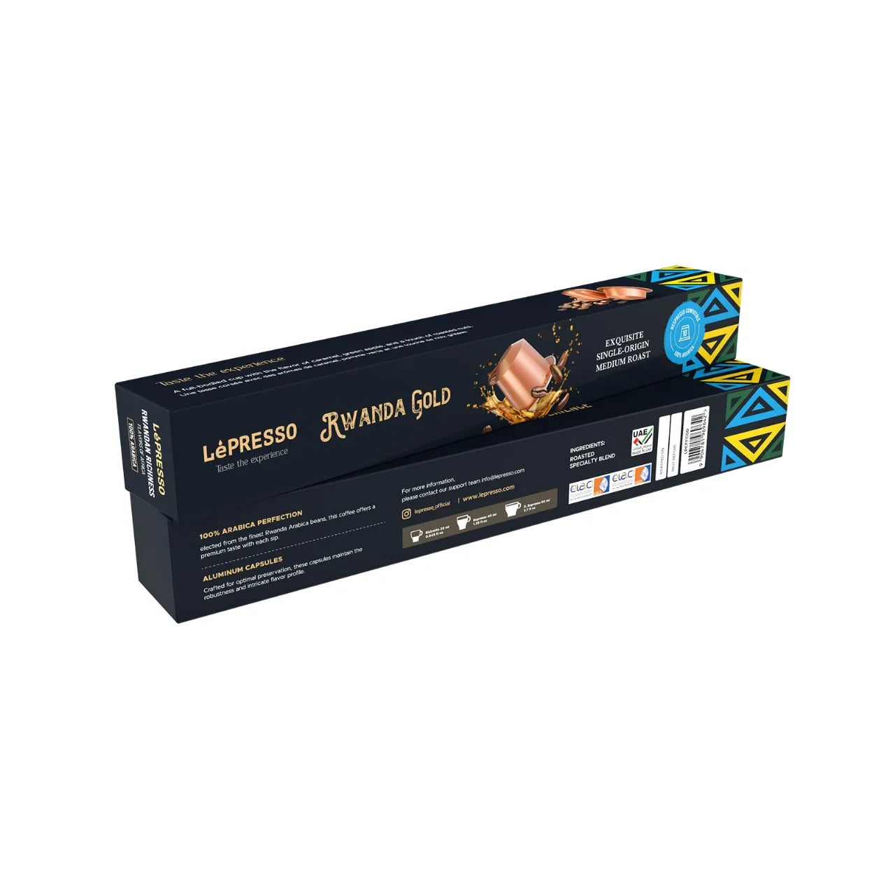 Experience the rich, aromatic flavors of Africa with Lepresso Rwanda Single Origin Coffee Capsules - Gold. Sourced from the highlands of Rwanda, these premium Nespresso®-compatible capsules deliver a smooth, full-bodied espresso with notes of citrus and floral undertones. Perfect for coffee lovers seeking a refined and sustainable brew.