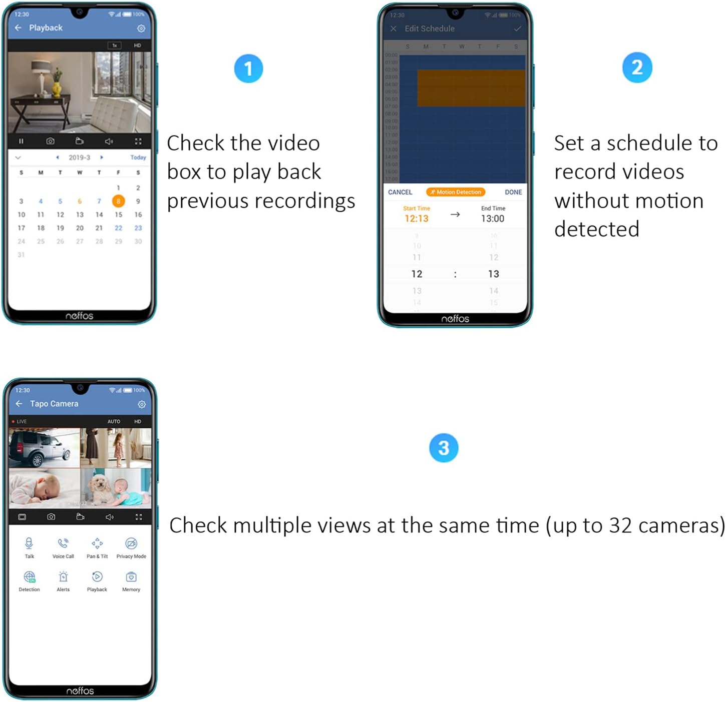 Ultra-High Definition Video - Records every image in ultra-high 3MP definition\n\nAdvanced Night Vision - Provides a visual distance of up to 30 ft\n\nMotion Detection and Notifications - Notifies you when the camera detects movement\n\nSound and Light Alarm - Trigger light and sound effects to frighten away unwanted visitors\n\nTwo-Way Audio - Enables communication through a built-in microphone and speaker\n\nSafe Storage - Locally stores up to 256 GB on a microSD card, equal to 512 hours (21 days) of footage (based on laboratory conditions)\n\nEasy Setup and Management - Manage everything with Tapo app