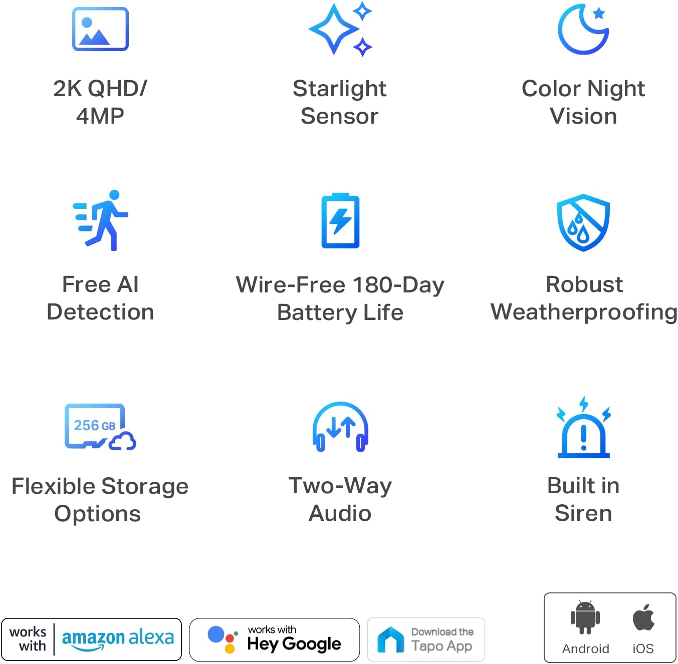 2K QHD-Now with 1.7 times more pixels than 1080p, providing clearer videos and photos.\n\n 180-Day Battery Life*-The rechargeable and removable battery with a low-power protocol extends your usage.\n\n Full-Color Night Vision-Reveal high-fidelity details and color at night with the starlight sensor.\n\n Smart AI Detection and Notification-Smart AI identifies people, pets, and cars, notifying users as needed.\n\n Wire-Free Placement-No wires means you can place the cameras almost anywhere inside or outside-whatever works for you!\n\n Light and Sound Alarm-Triggers sound and light as an alarm when motion is detected.\n\n Two-Way Audio-Enables communication through a built-in microphone and speaker.\n\n Flexible Storage Choices-Save recorded videos on the hub-installed microSD card (up to 256 GB) or by using Tapo Care** cloud storage services.\n\n IP65 Water&Dust Resistant-Offers excellent waterproof and dustproof performance for outdoor scenarios.