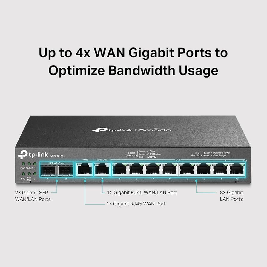 The TP-Link Omada ER7212PC is a powerful 3-in-1 Gigabit VPN Router with integrated PoE+ switch and Omada SDN controller. Designed for small to medium-sized businesses, it combines routing, PoE+ power supply, and centralized network management in one compact device. Key features include 8× PoE+ ports, VPN support, and seamless integration with Omada's software-defined networking platform.